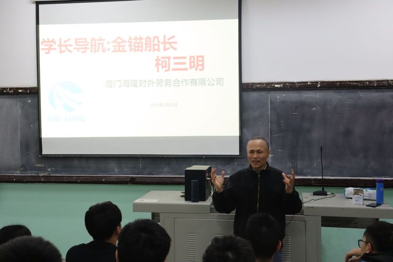 3月23日下午,廈門(mén)海隆對(duì)外勞務(wù)合作有限公司副總經(jīng)理林凱凌、船管部經(jīng)理柯三明、法務(wù)專員張悅文一行三人來(lái)到航海學(xué)院為2022屆航海類(航海技術(shù)專業(yè)、輪機(jī)工程技術(shù)專業(yè))學(xué)生做企業(yè)文化宣講。
