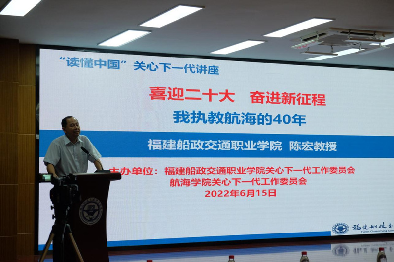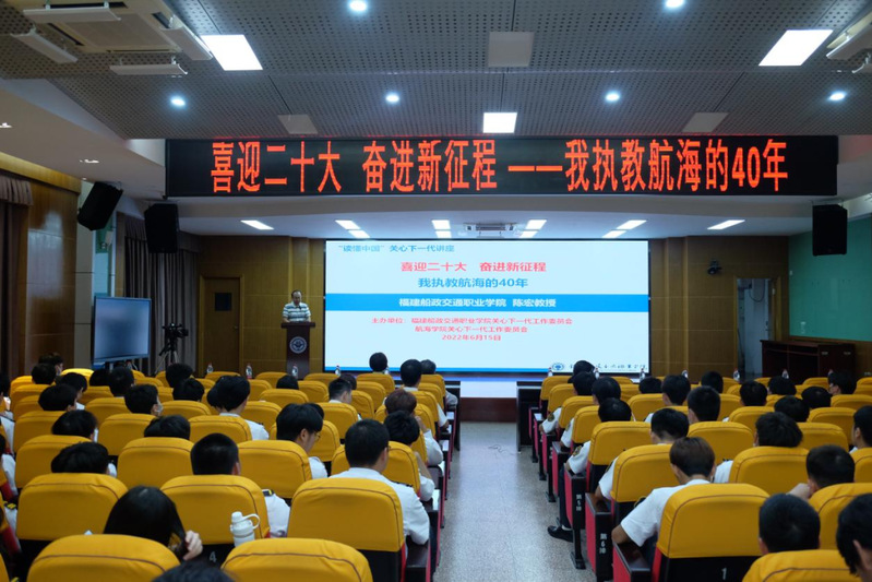 2022年6月15日晚,由學(xué)院關(guān)工委主辦,航海學(xué)院承辦的福建船政交通職業(yè)學(xué)院“讀懂中國”關(guān)心下一代講座在北區(qū)一號樓學(xué)術(shù)廳成功舉辦。陳宏教授為現(xiàn)場的同學(xué)們做了題為《喜迎二十大 奮進新征程 —我執(zhí)教航海的40年》的講座。講座由航海學(xué)院黨總支書記江文主持,福建省教育系統(tǒng)關(guān)工委副主任陳晃和關(guān)工委副秘書長兼辦公室主任羅文倩到場蒞臨指導(dǎo)。