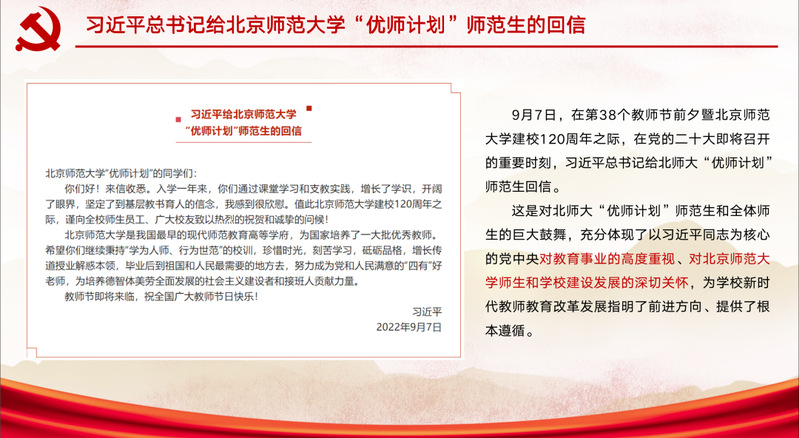 陳林泉老師:習(xí)近平總書記的回信,體現(xiàn)了以習(xí)近平同志為核心的黨中央對(duì)教育事業(yè)發(fā)展的高度重視,對(duì)北師大師生和學(xué)校建設(shè)發(fā)展的深切關(guān)懷。作為“四有”好老師的首倡地,北師大肩負(fù)著培養(yǎng)追夢(mèng)人和筑夢(mèng)人的雙重任務(wù),教育引導(dǎo)黨員同志廣大青年學(xué)子珍惜時(shí)光,刻苦學(xué)習(xí),砥礪品格,傳承校訓(xùn)精神,到祖國和人民最需要的地方去建功立業(yè)。