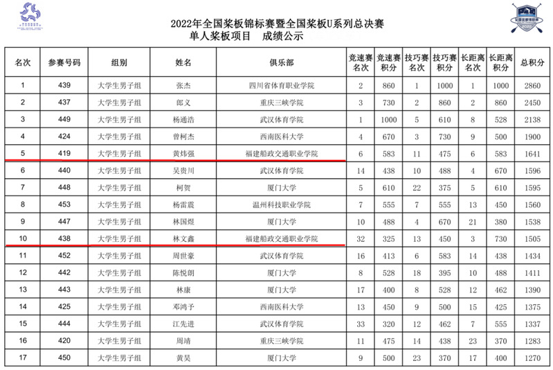 本次賽事分為精英組、公開組、大學(xué)生組、青少年組。福建船政交通職業(yè)學(xué)院航海學(xué)院組織校槳板隊(duì)參加大學(xué)生組別賽事。黃煒強(qiáng)、林文鑫發(fā)揚(yáng)船政精神,努力拼搏,分別取得大學(xué)生組總積分第5名和第10名的好成績。