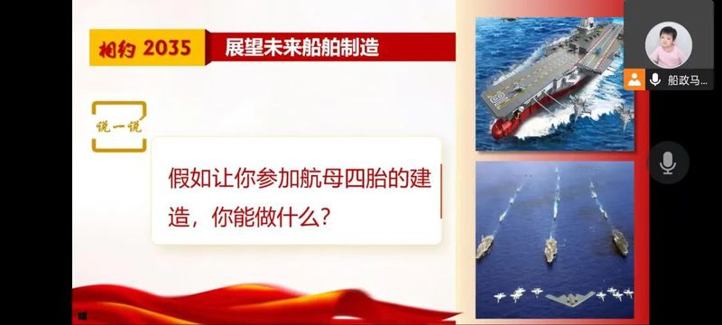 同時(shí),黃其連老師結(jié)合航海學(xué)生專業(yè)實(shí)際,以航母三胎“福建艦”作為案例,讓同學(xué)們了解我國(guó)船舶制造業(yè)跨越式發(fā)展的成果。并發(fā)起討論“假如你有機(jī)會(huì)參與航母四胎的建造,你能做些什么”,通過(guò)話題討論,引導(dǎo)學(xué)生展望2035船舶制造,堅(jiān)定學(xué)生“我要做什么、學(xué)什么、怎么做”的奮斗決心,把個(gè)人夢(mèng)融入中國(guó)2035“海洋強(qiáng)國(guó)夢(mèng)”,堅(jiān)定強(qiáng)技報(bào)國(guó)的信念。