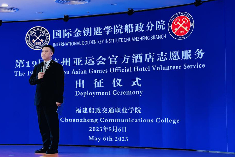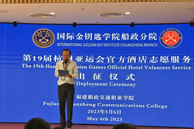 出征儀式首先由中國金鑰匙副秘書長、國際金鑰匙學院(中國區(qū))運營官張勇先生宣讀了國際金鑰匙學院船政分院第十九屆杭州亞運會官方酒店志愿者錄用結(jié)果并致辭,他向志愿者代表們表示祝賀,他激勵同學們時刻秉承金鑰匙服務(wù)哲學全身心投入亞運志愿活動中。、