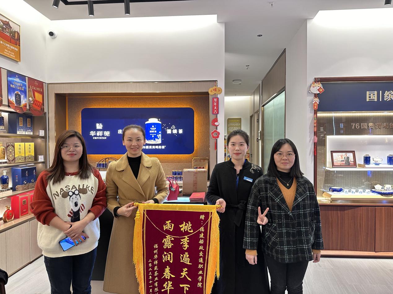 2023年12月27日,國際郵輪乘務(wù)教研室陳華和黃娜琴老師赴福建華祥苑茶業(yè)有限公司巡查學(xué)生頂崗實(shí)習(xí)情況。兩位老師了解了企業(yè)發(fā)展的近況,來到實(shí)習(xí)生林雨欣的工作場所深入了解學(xué)生的工作和生活情況,同時(shí)鼓勵(lì)實(shí)習(xí)生要增強(qiáng)對(duì)工作的興趣,抓住機(jī)會(huì)多動(dòng)手實(shí)踐,為職業(yè)發(fā)展夯實(shí)基礎(chǔ)。兩位老師在與學(xué)生的交流溝通中,叮囑學(xué)生要遵守企業(yè)的規(guī)章制度,以準(zhǔn)職業(yè)人的身份,把握實(shí)習(xí)機(jī)會(huì),充分鍛煉自己,為將來步入社會(huì)打牢基礎(chǔ)。企業(yè)人事總監(jiān)薛蘭蘭女士為我院授予錦旗--桃李遍天下,雨露潤春華。