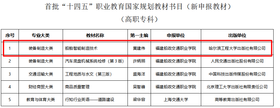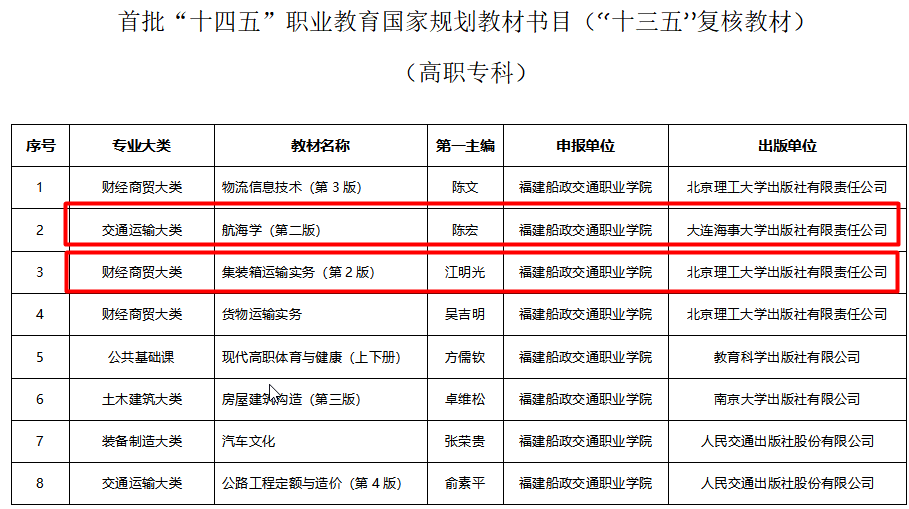 6月30日,教育部公布了首批“十四五”職業(yè)教育國(guó)家規(guī)劃教材書(shū)目,根據(jù)《“十四五”職業(yè)教育規(guī)劃教材建設(shè)實(shí)施方案》和《教育部辦公廳關(guān)于組織開(kāi)展“十四五”首批職業(yè)教育國(guó)家規(guī)劃教材遴選工作的通知》要求,經(jīng)有關(guān)單位申報(bào)、形式審查、專(zhuān)家評(píng)審、專(zhuān)項(xiàng)審核、專(zhuān)家復(fù)核、面向社會(huì)公示等程序,共確定7251種教材入選首批“十四五”職業(yè)教育國(guó)家規(guī)劃教材(以下簡(jiǎn)稱“十四五”國(guó)規(guī)教材),涵蓋全部19個(gè)專(zhuān)業(yè)大類(lèi)、1382個(gè)專(zhuān)業(yè)。航海技術(shù)專(zhuān)業(yè)群入選三本,其中新申報(bào)入選1本,“十三五”復(fù)核教材入選兩本。
