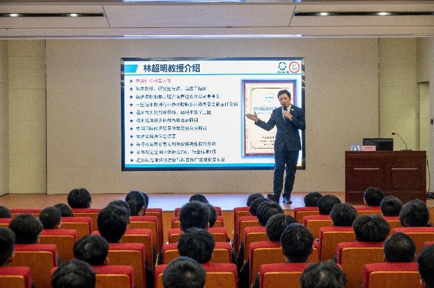 作為中國航??破沾笫?/span>,林超明先生首先介紹了中國航海學(xué)會、福建省航海學(xué)會以及福州海洋經(jīng)濟(jì)科創(chuàng)高地在航海科普工作中的重要作用。他強(qiáng)調(diào),中國航海學(xué)會作為推動航海知識普及的重要平臺,致力于通過多種形式的科普活動提升公眾對航海事業(yè)的認(rèn)知與興趣。福建省航海學(xué)會是福建省內(nèi)5A級學(xué)會,是福建省內(nèi)推廣中國航??破瘴幕凝堫^學(xué)會。福州海洋經(jīng)濟(jì)科創(chuàng)高地是福州鼓樓踐行福州向海圖強(qiáng)戰(zhàn)略的海洋科創(chuàng)示范載體,通過創(chuàng)新創(chuàng)業(yè)、成果展示與轉(zhuǎn)化、科普研學(xué)等活動進(jìn)一步推動航海事業(yè)高質(zhì)量發(fā)展。當(dāng)下是我國航海事業(yè)的發(fā)展的重要契機(jī),希望在座的船政學(xué)子能學(xué)好專業(yè)知識,為未來投身航海事業(yè)打好基礎(chǔ)。