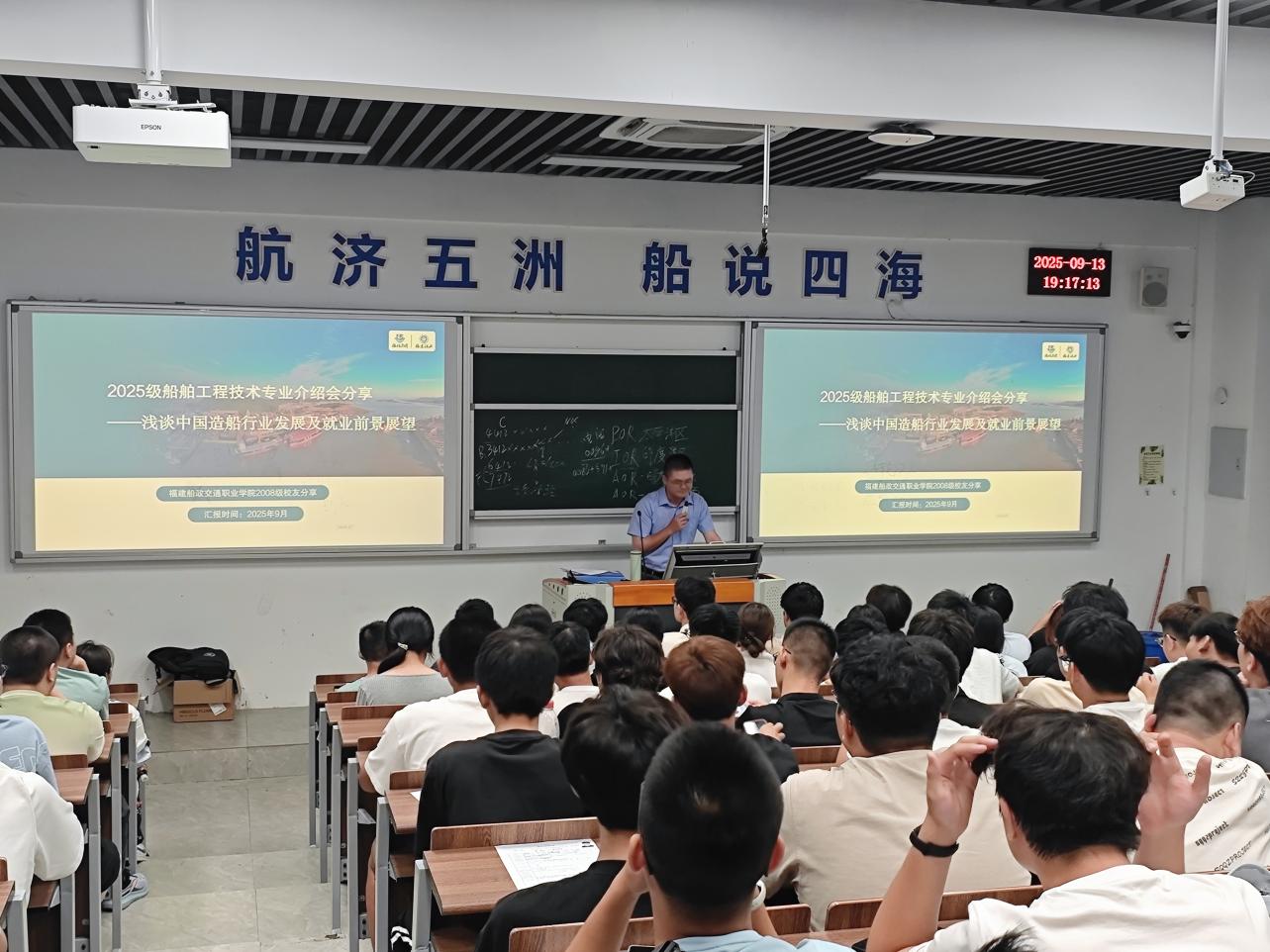 本次介紹會特邀畢業(yè)于福建船政交通職業(yè)技術(shù)學院、現(xiàn)任福建船政重工股份有限公司的優(yōu)秀校友-王亞峰學長回校分享。他結(jié)合個人成長經(jīng)歷,講述從校園到企業(yè)的蛻變歷程與工作寶貴經(jīng)驗,鼓勵同學們珍惜在校時光、扎實學習專業(yè)知識并積極參與實踐項目;同時圍繞國家海洋強國戰(zhàn)略和造船產(chǎn)業(yè)政策,分析行業(yè)發(fā)展新機遇,強調(diào)船舶工程技術(shù)人才對制造業(yè)高質(zhì)量發(fā)展的重要作用,還以詳實數(shù)據(jù)和案例淺析國內(nèi)外造船行業(yè)在綠色船舶、智能造船、高端裝備制造等方向的發(fā)展現(xiàn)狀與趨勢,幫助同學們建立行業(yè)前景宏觀認知,并展望就業(yè)前景,指出海洋經(jīng)濟升溫與科技革命深入背景下,船舶設計與制造、工藝管理、質(zhì)量檢驗等崗位需求將持續(xù)增長,就業(yè)前景廣闊。