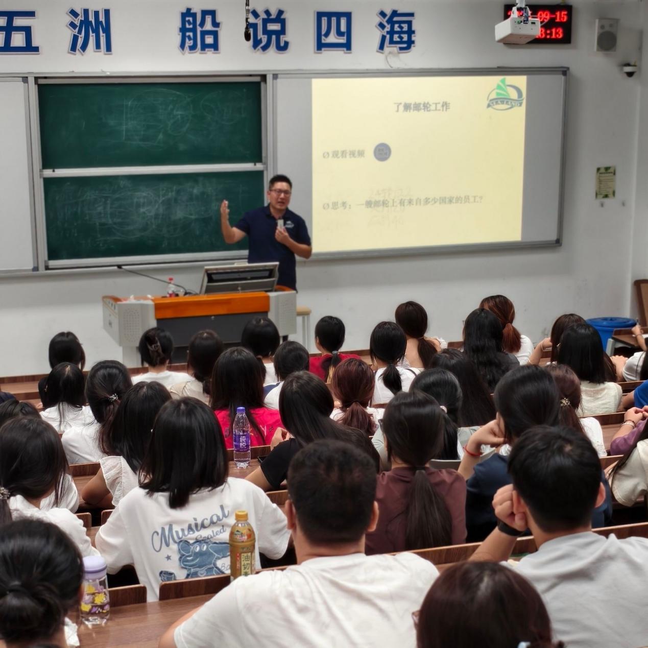 隨后,廈門海陸海事服務(wù)有限公司李樂天經(jīng)理結(jié)合多年行業(yè)經(jīng)驗,深入剖析了國際郵輪產(chǎn)業(yè)的發(fā)展趨勢與人才需求。他指出,隨著全球郵輪旅游市場的復(fù)蘇與擴(kuò)張,具備國際化視野、跨文化溝通能力和扎實服務(wù)技能的乘務(wù)人才備受青睞。李經(jīng)理以本校2015級優(yōu)秀畢業(yè)生陳麗娜(現(xiàn)任職于歌詩達(dá)郵輪)為例,鼓勵新生珍惜在校時光,夯實語言、禮儀與應(yīng)急處理能力,積極考取國際認(rèn)證證書,為未來登上世界知名郵輪公司奠定堅實基礎(chǔ)。