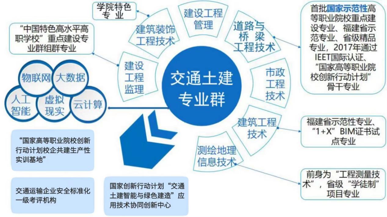 目前,土木工程學院招生的專業(yè)有道路與橋梁工程技術、市政工程技術、建設工程監(jiān)理、測繪與地理信息技術、建筑工程技術、建設工程管理、建筑裝飾工程技術等7個專業(yè)。其中,道路與橋梁工程技術是首批國家示范性高等職業(yè)院校建設計劃中央財政重點支持建設的專業(yè)(簡稱“國家示范校重點專業(yè)”)、國家創(chuàng)新發(fā)展行動計劃骨干專業(yè)、福建省示范專業(yè)、福建省精品專業(yè),“福建省雙高”重點建設專業(yè)群的核心專業(yè),2017年通過IEET國際認證;建設工程監(jiān)理專業(yè)是“中國特色高水平高職學校與高水平專業(yè)建設計劃”(簡稱“國家雙高”)高水平專業(yè)群的組群專業(yè);市政工程技術、測繪與地理信息技術、建設工程管理專業(yè)是“福建省雙高”重點建設專業(yè)群(道路與橋梁工程技術專業(yè)群)的組群專業(yè);建筑工程技術是福建省示范專業(yè);建筑裝飾工程技術專業(yè)為學校特色專業(yè)。