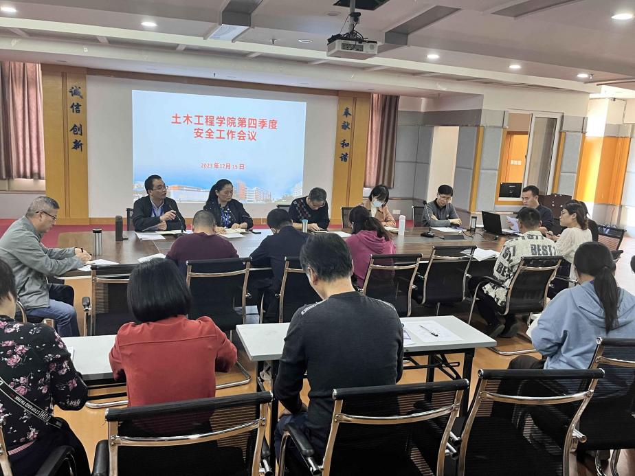 為推動(dòng)校園安全工作高質(zhì)量發(fā)展,按照年度安全工作計(jì)劃安排,土木工程學(xué)院于2023年12月15日下午在創(chuàng)新樓1007會(huì)議室召開(kāi)了第四季度安全工作會(huì)議。會(huì)議就第四季度安全工作進(jìn)行總結(jié)并部署下一季度安全工作。土木工程學(xué)院領(lǐng)導(dǎo)班子成員、組織員、辦公室人員、全體輔導(dǎo)員及全體實(shí)訓(xùn)中心成員參加了會(huì)議,會(huì)議由朱明栓副院長(zhǎng)主持。