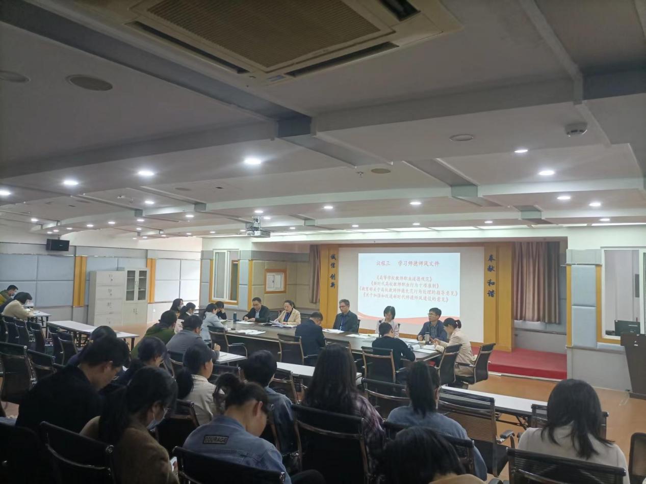 會(huì)上,首先集中學(xué)習(xí)了習(xí)近平總書記在中央政治局進(jìn)行第五次集體學(xué)習(xí)上發(fā)表的重要講話精神、習(xí)近平致全國(guó)優(yōu)秀教師代表的信、《高等學(xué)校教師職業(yè)道德規(guī)范》《新時(shí)代高校教師職業(yè)行為十項(xiàng)準(zhǔn)則》《教育部關(guān)于高校教師師德失范行為處理的指導(dǎo)意見》《關(guān)于加強(qiáng)和改進(jìn)新時(shí)代師德師風(fēng)建設(shè)的意見》,通報(bào)了《教育部曝光7起違反教師職業(yè)行為十項(xiàng)準(zhǔn)則典型案例》。