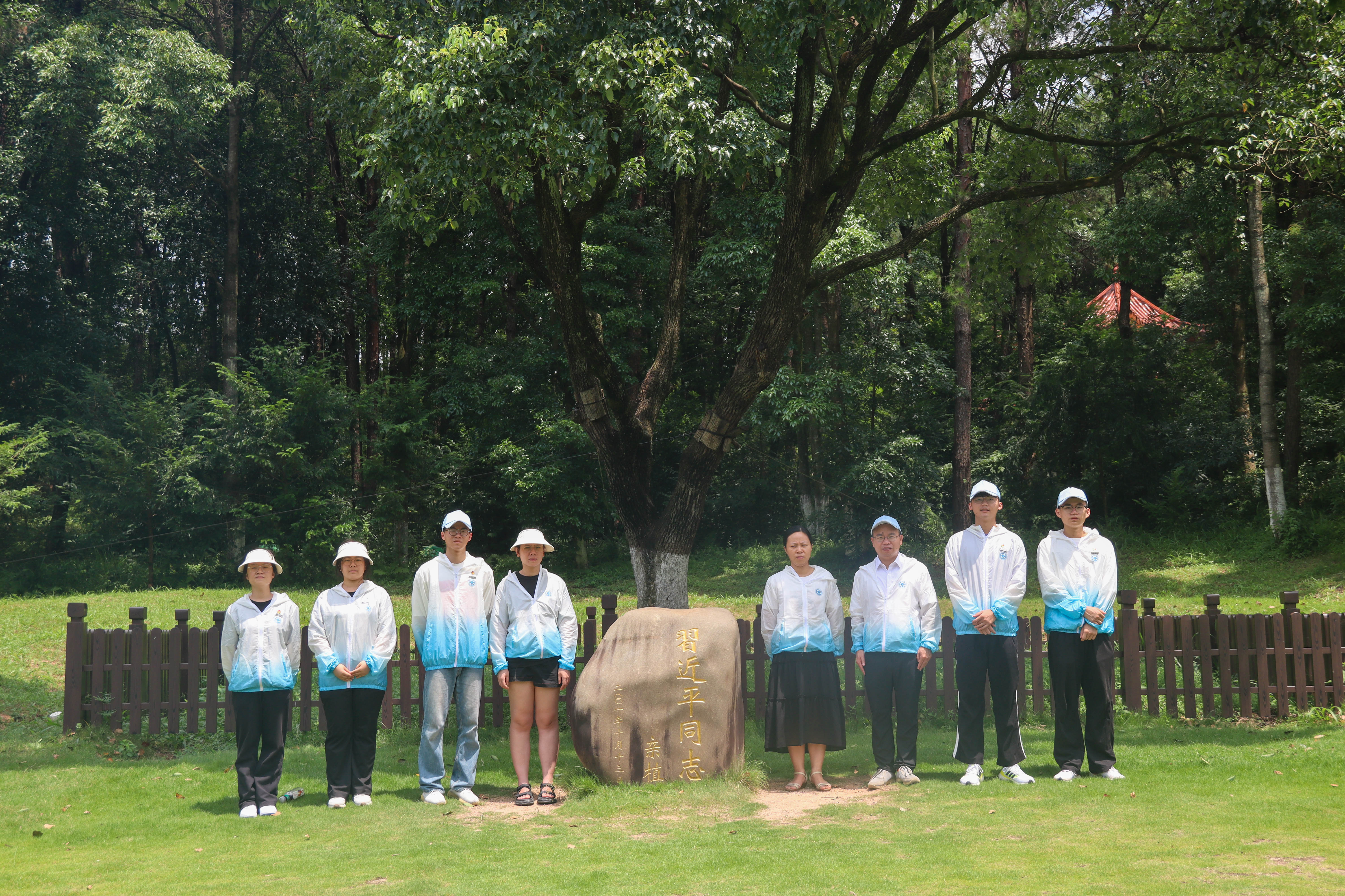 圖10:實(shí)踐團(tuán)師生在習(xí)近平總書記捐種的香樟樹前合影,感受習(xí)近平生態(tài)文明思想的光輝