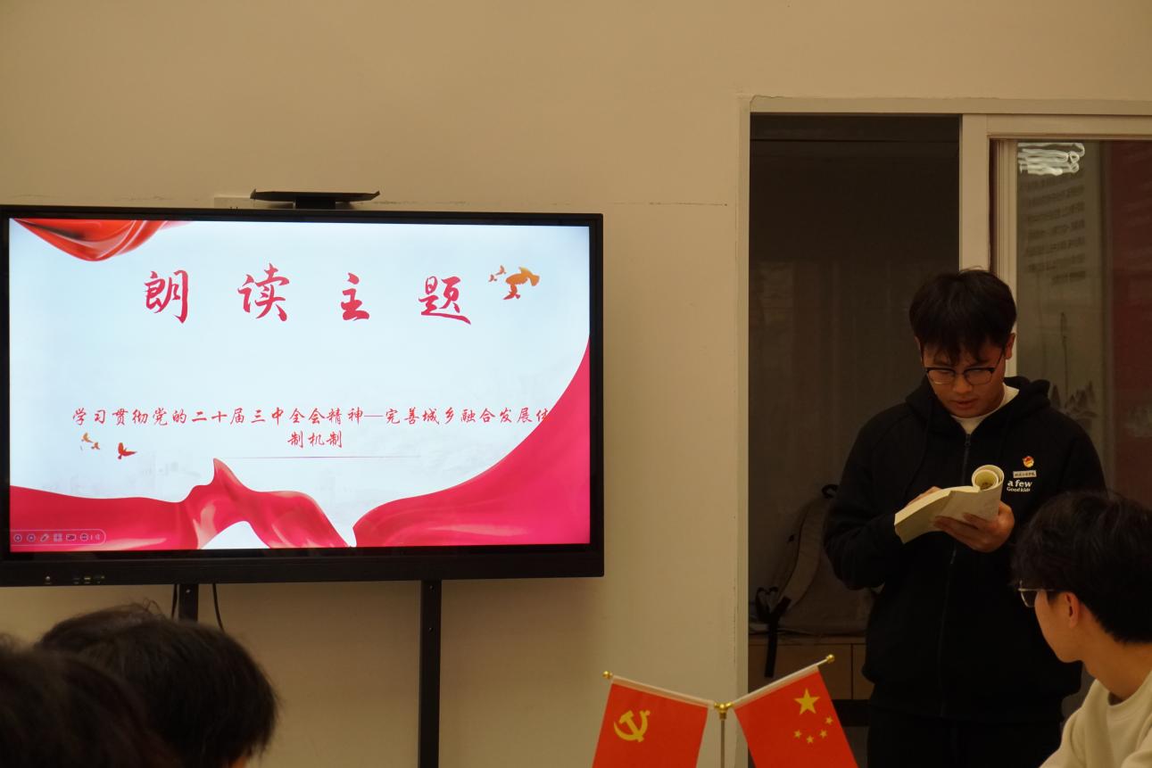 分享會上,2024級建筑工程技術(shù)3班班長江順,土木工程學(xué)院實踐部成員,領(lǐng)學(xué)朗讀了《中共中央關(guān)于進(jìn)一步全面深化改革、推進(jìn)中國式現(xiàn)代化的決定》(后文簡稱《決定》)“完善城鄉(xiāng)融合發(fā)展體制機制”部分。