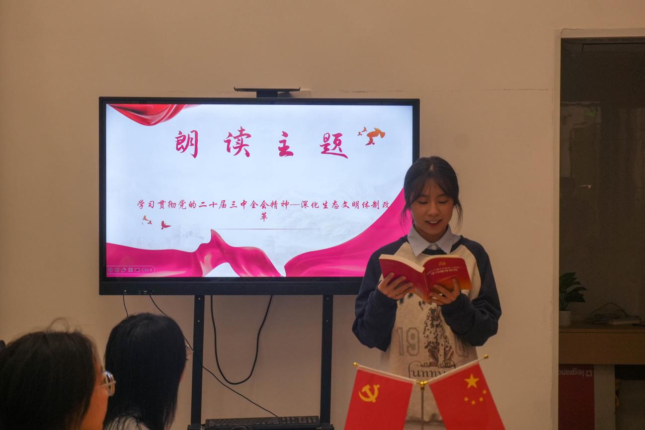 分享會上,2024級建筑裝飾工程技術(shù)1班班長兼團(tuán)支書薛藝湘,領(lǐng)學(xué)朗讀了《中共中央關(guān)于進(jìn)一步全面深化改革、推進(jìn)中國式現(xiàn)代化的決定》(后文簡稱《決定》)“深化生態(tài)文明體制改革”部分。