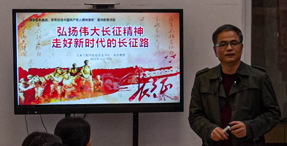為深入學(xué)習(xí)宣傳貫徹習(xí)近平新時(shí)代中國(guó)特色社會(huì)主義思想和黨的二十屆三中全會(huì)精神,引導(dǎo)青年學(xué)生堅(jiān)定馬克思主義信仰、中國(guó)特色社會(huì)主義信念、中華民族偉大復(fù)興信心,深刻領(lǐng)悟中國(guó)共產(chǎn)黨人精神譜系的豐富內(nèi)涵和時(shí)代意義,傳承紅色基因,賡續(xù)紅色血脈,2024年12月10日下午,土木工程學(xué)院黨總支書(shū)記高杰教授在福航園“一站式”學(xué)生社區(qū)思政引領(lǐng)室以“弘揚(yáng)偉大長(zhǎng)征精神,走好新時(shí)代的長(zhǎng)征路”為題給青年學(xué)生上形勢(shì)與政策課暨專(zhuān)題思政課。
