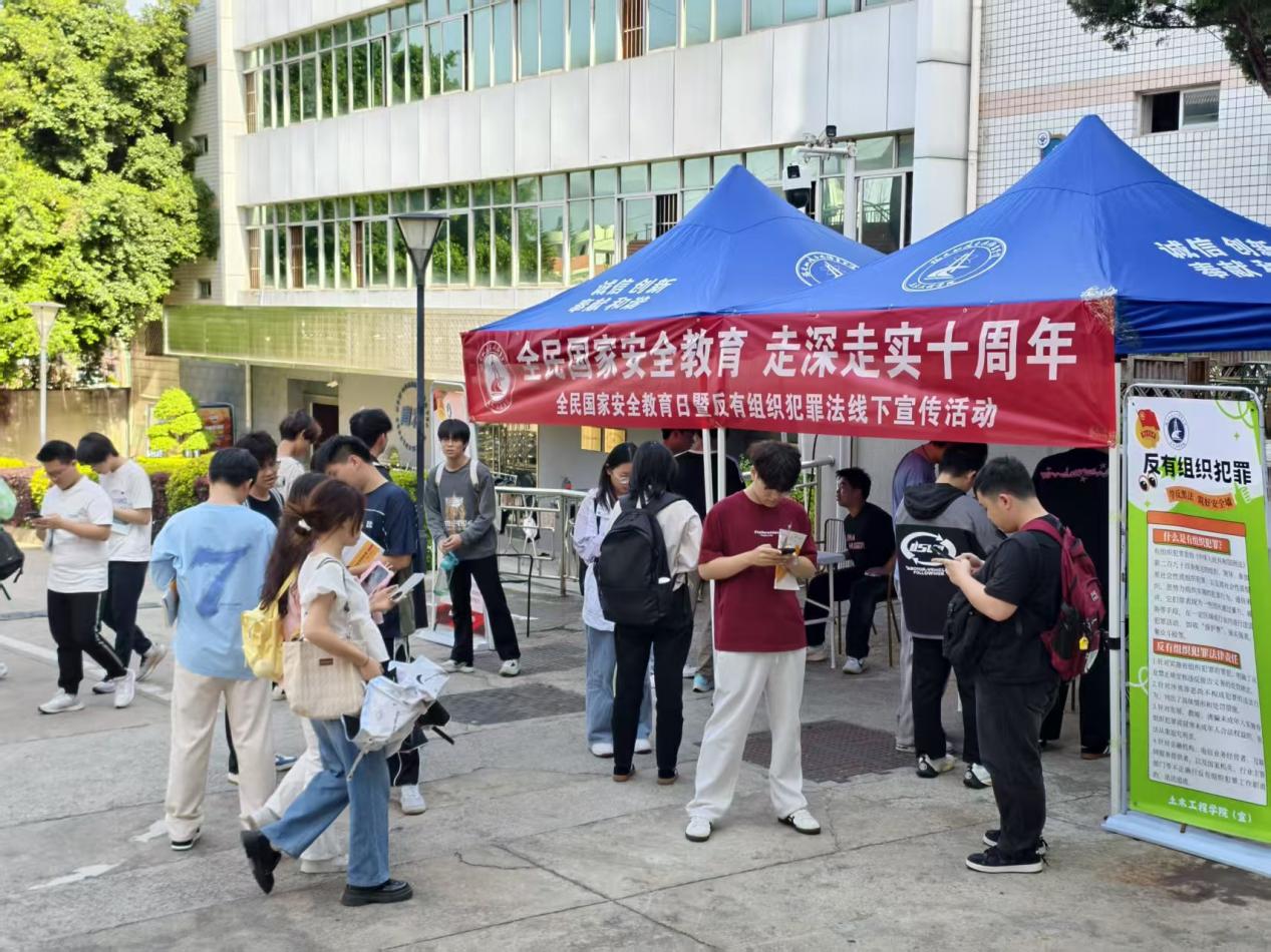 2025年4月15日是第十個全民國家安全教育日,為深入學(xué)習(xí)貫徹習(xí)近平總書記關(guān)于國家安全的重要講話精神,貫徹落實總體國家安全觀,筑牢反有組織犯罪的社會防線,建設(shè)平安法治校園。4月15日,土木工程學(xué)院于福航園“一站式”學(xué)生社區(qū),開展“全民國家安全教育,走深走實十周年”全民國家安全教育日暨《反有組織犯罪法》線下宣傳活動。