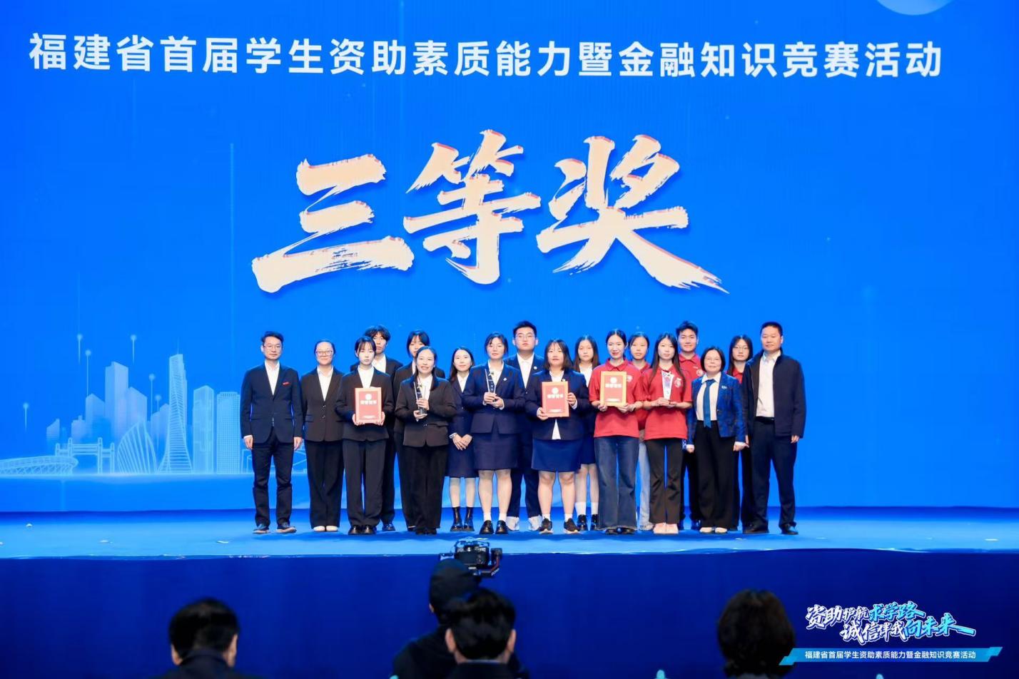 2025 年 11 月 28 日,福建省首屆學生資助素質能力暨金融知識競賽在福建醫(yī)科大學旗山校區(qū)圓滿落幕。土木工程學院梁文娟、鐘騰嬌兩位老師與黃紫萱、翁若淇、王新銘三名同學組成的 “政啟遠航” 代表隊,在入圍決賽的 20 支隊伍中奮勇爭先、脫穎而出,最終斬獲福建省三等獎及優(yōu)秀組織獎,充分彰顯我院師生扎實的資助政策知識儲備與良好的金融素養(yǎng)。