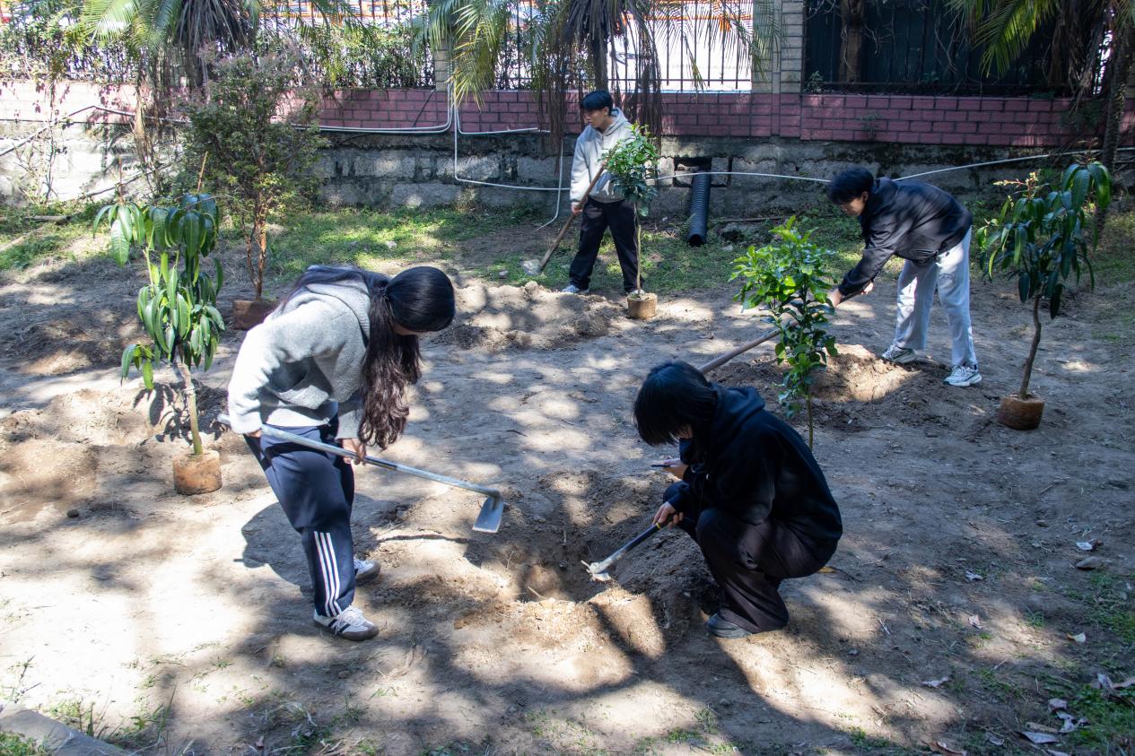 植樹現(xiàn)場(chǎng),熱火朝天。老師和同學(xué)們手持鐵鍬、水桶,分工協(xié)作,干勁十足。挖坑、扶苗、培土、澆水……同學(xué)們揮汗如雨,數(shù)株帶著美好寓意的樹苗便“安家落戶”——象征甜蜜生活的樹葡萄、散發(fā)清香的檸檬樹、期待盛夏佳果的荔枝和芒果樹,在春風(fēng)中輕輕搖曳,為校園增添了片片新綠和無(wú)限憧憬。