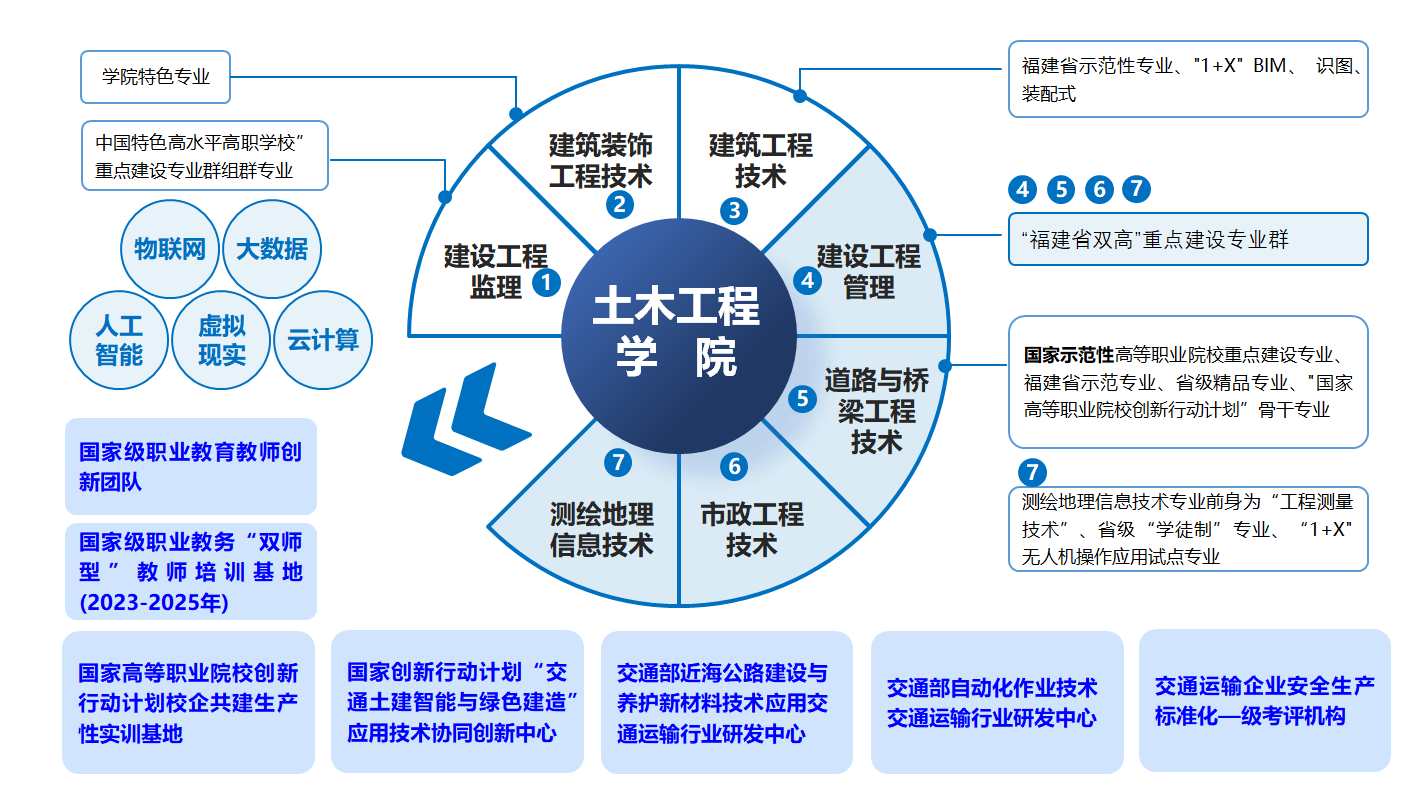 土木工程學(xué)院是全省重要的交通工程建設(shè)與管理高素質(zhì)技術(shù)技能人才培養(yǎng)基地?,F(xiàn)有國家級職業(yè)教育教師創(chuàng)新團(tuán)隊、國家級交通土建智能與綠色建造應(yīng)用技術(shù)協(xié)同創(chuàng)新中心、國家級職業(yè)教育“雙師型”教師培訓(xùn)基地、國家高等職業(yè)院校創(chuàng)新行動計劃校企共建生產(chǎn)性實(shí)訓(xùn)基地、交通部自動化作業(yè)技術(shù)交通運(yùn)輸行業(yè)研發(fā)中心,交通部近海公路建設(shè)與養(yǎng)護(hù)新材料技術(shù)應(yīng)用交通運(yùn)輸行業(yè)研發(fā)中心,獲交通運(yùn)輸企業(yè)安全生產(chǎn)標(biāo)準(zhǔn)化一級評價機(jī)構(gòu)資質(zhì)。在校生約3500人,自1974年開辦以來,已為行業(yè)輸送超2萬名交通土建類相關(guān)專業(yè)畢業(yè)生,為服務(wù)“交通強(qiáng)國”戰(zhàn)略,加快建設(shè)交通強(qiáng)國福建先行區(qū),推動福建建設(shè)交通強(qiáng)省、構(gòu)建海峽兩岸融合發(fā)展示范區(qū)提供人才支撐。