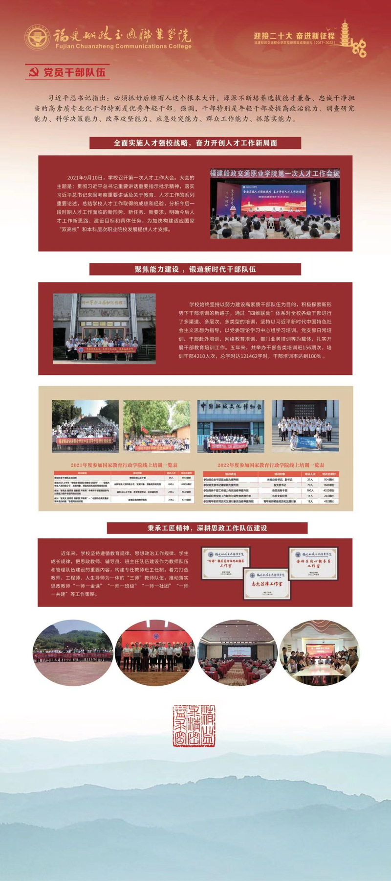 今年是黨的二十大召開之年,是學(xué)校深化綜合改革、加快“雙高”建設(shè)的關(guān)鍵年,是續(xù)寫過去5年工作、回首新時代10年變革的轉(zhuǎn)折年。站在新的歷史起點上,船政交通人將始終沿著習(xí)近平總書記親自為福建擘畫的最美山水圖、沿革船政先賢留下的文化瑰寶、延續(xù)一代代船政交通人接續(xù)奮斗的精神,以飽滿的精神、昂揚的斗志、奮進的狀態(tài),開啟建設(shè)中國特色高水平高職學(xué)校的新征程,以優(yōu)異成績迎接黨的二十大勝利召開!