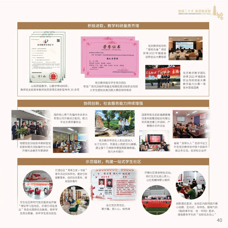 十九大以來,福建船政交通職業(yè)學(xué)院堅持以習(xí)近平新時代中國特色社會主義思想為指導(dǎo),堅持社會主義辦學(xué)方向,深入貫徹黨的十九大和十九屆歷次全會精神,堅守“為黨育人、為國育才”的初心和使命,慎終如始推進(jìn)學(xué)校黨的政治建設(shè)、思想建設(shè)、組織建設(shè)、作風(fēng)建設(shè)、紀(jì)律建設(shè)、制度建設(shè),黨的組織體系和學(xué)校治理體系相得益彰,黨建引領(lǐng)推動創(chuàng)新船政、質(zhì)量船政、文化船政協(xié)奏齊鳴,政治生態(tài)、學(xué)術(shù)生態(tài)、文化生態(tài)持續(xù)向好,辦學(xué)效率、辦學(xué)效能、辦學(xué)效益顯著提升!