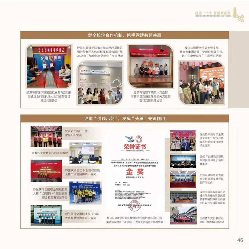 十九大以來,福建船政交通職業(yè)學(xué)院堅持以習(xí)近平新時代中國特色社會主義思想為指導(dǎo),堅持社會主義辦學(xué)方向,深入貫徹黨的十九大和十九屆歷次全會精神,堅守“為黨育人、為國育才”的初心和使命,慎終如始推進學(xué)校黨的政治建設(shè)、思想建設(shè)、組織建設(shè)、作風(fēng)建設(shè)、紀律建設(shè)、制度建設(shè),黨的組織體系和學(xué)校治理體系相得益彰,黨建引領(lǐng)推動創(chuàng)新船政、質(zhì)量船政、文化船政協(xié)奏齊鳴,政治生態(tài)、學(xué)術(shù)生態(tài)、文化生態(tài)持續(xù)向好,辦學(xué)效率、辦學(xué)效能、辦學(xué)效益顯著提升!