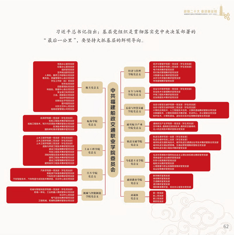 十九大以來,福建船政交通職業(yè)學(xué)院堅(jiān)持以習(xí)近平新時代中國特色社會主義思想為指導(dǎo),堅(jiān)持社會主義辦學(xué)方向,深入貫徹黨的十九大和十九屆歷次全會精神,堅(jiān)守“為黨育人、為國育才”的初心和使命,慎終如始推進(jìn)學(xué)校黨的政治建設(shè)、思想建設(shè)、組織建設(shè)、作風(fēng)建設(shè)、紀(jì)律建設(shè)、制度建設(shè),黨的組織體系和學(xué)校治理體系相得益彰,黨建引領(lǐng)推動創(chuàng)新船政、質(zhì)量船政、文化船政協(xié)奏齊鳴,政治生態(tài)、學(xué)術(shù)生態(tài)、文化生態(tài)持續(xù)向好,辦學(xué)效率、辦學(xué)效能、辦學(xué)效益顯著提升!