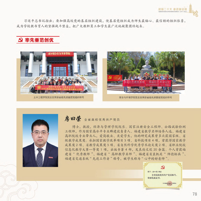 十九大以來(lái),福建船政交通職業(yè)學(xué)院堅(jiān)持以習(xí)近平新時(shí)代中國(guó)特色社會(huì)主義思想為指導(dǎo),堅(jiān)持社會(huì)主義辦學(xué)方向,深入貫徹黨的十九大和十九屆歷次全會(huì)精神,堅(jiān)守“為黨育人、為國(guó)育才”的初心和使命,慎終如始推進(jìn)學(xué)校黨的政治建設(shè)、思想建設(shè)、組織建設(shè)、作風(fēng)建設(shè)、紀(jì)律建設(shè)、制度建設(shè),黨的組織體系和學(xué)校治理體系相得益彰,黨建引領(lǐng)推動(dòng)創(chuàng)新船政、質(zhì)量船政、文化船政協(xié)奏齊鳴,政治生態(tài)、學(xué)術(shù)生態(tài)、文化生態(tài)持續(xù)向好,辦學(xué)效率、辦學(xué)效能、辦學(xué)效益顯著提升!