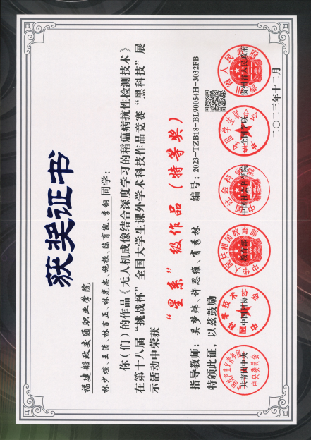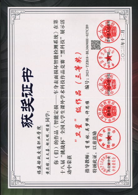 黨員教師率先垂范,帶領(lǐng)學(xué)生奮勇爭先,扎根農(nóng)田,把科研成果寫在祖國的大地上,發(fā)揮科創(chuàng)育人作用,激勵廣大青年勤奮學(xué)習(xí),大膽實踐,勇于創(chuàng)新,以賽促學(xué),以賽促教,以賽促創(chuàng),由肖秀林,許思維,吳夢煒老師所帶領(lǐng)“無人機成像結(jié)合深度學(xué)習(xí)的稻瘟病抗性檢測技術(shù)”團隊榮獲第十八屆挑戰(zhàn)杯全國大學(xué)生課外學(xué)術(shù)科技作品競賽黑科技專項賽星際級特等獎,實現(xiàn)校級在該獎項的零突破,“智能定損車身表面損壞智能檢測系統(tǒng)”團隊榮獲第十八屆挑戰(zhàn)杯全國大學(xué)生課外學(xué)術(shù)科技作品競賽黑科技專項賽衛(wèi)星級三等獎。由戴立慶、李烈熊帶領(lǐng)的團隊在福建省職業(yè)技能大賽高職組風(fēng)光互補發(fā)電系統(tǒng)安裝與調(diào)試團體一等獎,由游德智、肖麗佳帶領(lǐng)的團隊獲2023年全國職業(yè)院校高職組建筑智能化系統(tǒng)安裝與調(diào)試三等獎。