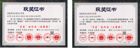 圖3 獲得第十八屆挑戰(zhàn)杯全國大學(xué)生課外學(xué)術(shù)科技作品競賽黑科技專項賽星際級特等獎及衛(wèi)星級三等獎
