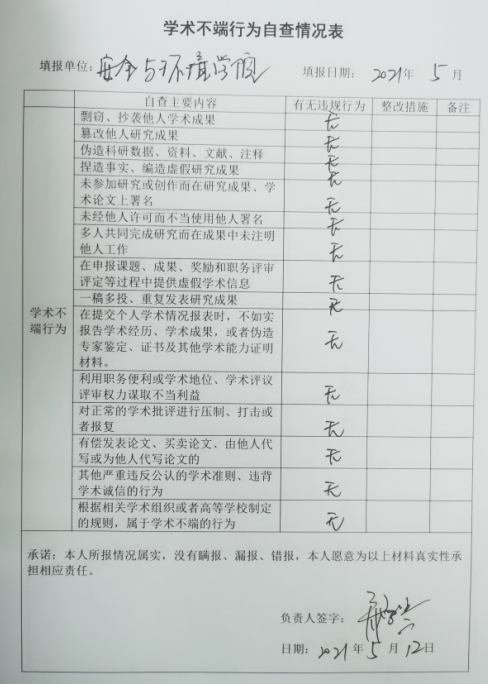 2、開展師風(fēng)師德自查。逐個教師、逐個教研室進(jìn)行徹底排查,落實每個教職工在思想政治紀(jì)律、學(xué)術(shù)道德、教育教學(xué)、工作作風(fēng)、生活行為、廉潔從教及其他等諸方面是否存在師德失范行為。全體教職工公開表態(tài)承諾,并簽訂《安全與環(huán)境學(xué)院教師師德失范行為負(fù)面清單自查承諾書》和《學(xué)術(shù)不端行為自查情況表》。