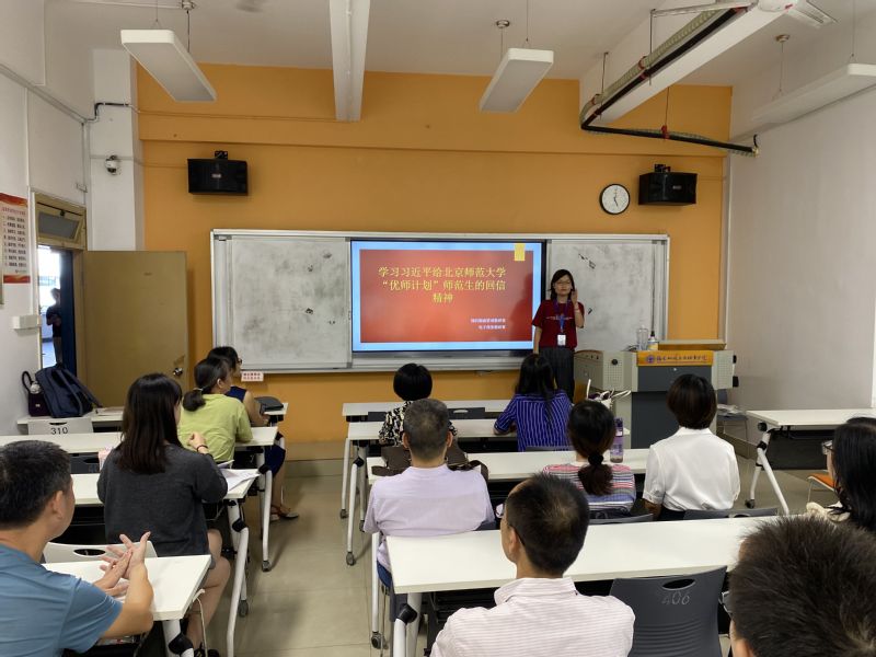 學(xué)習(xí)會上,俞素平書記帶領(lǐng)全體與會教師學(xué)習(xí)了習(xí)近平總書記給北京師范大學(xué)“優(yōu)師計劃”師范生重要回信內(nèi)容,并觀看了專題片《習(xí)近平的教師情》。