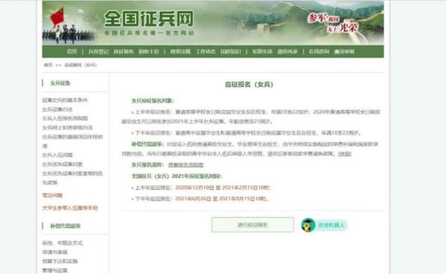 報(bào)名:上半年從2020年12月10日至2021年2月15日18時(shí),女性適齡青年登錄“全國(guó)征兵網(wǎng)”填寫個(gè)人基本信息。