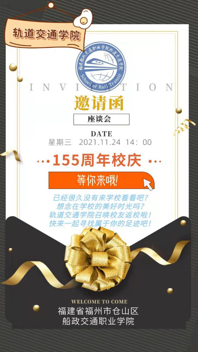 林經(jīng)夜霜,燕去歸鴻,又迎校慶,相邀船政。為了進(jìn)一步聯(lián)絡(luò)校友、回顧美好大學(xué)生活、共敘師生情意。我院擬于11月24日召開(kāi)校友座談會(huì),歡迎各位校友們回到這個(gè)充滿青春回憶的地方,再次留下你們的足跡。
