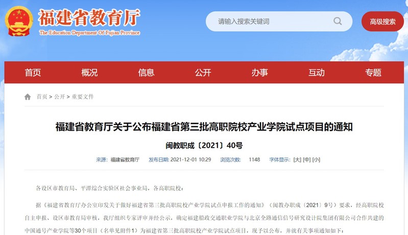根據(jù)《福建省教育廳關(guān)于公布福建省第三批高職院校產(chǎn)業(yè)學(xué)院試點(diǎn)項(xiàng)目的通知》(閩教職成〔2021〕40號(hào)),福建船政交通職業(yè)學(xué)院軌道交通學(xué)院與北京全路通信信號(hào)研究設(shè)計(jì)院集團(tuán)有限公司合作建立的中國(guó)通號(hào)產(chǎn)業(yè)學(xué)院成功入選福建省第三批高職院校產(chǎn)業(yè)學(xué)院試點(diǎn)項(xiàng)目,這是福建船政交通職業(yè)學(xué)院軌道交通學(xué)院堅(jiān)持立德樹人根本宗旨、落實(shí)產(chǎn)教融合創(chuàng)新發(fā)展的重要成果體現(xiàn)。