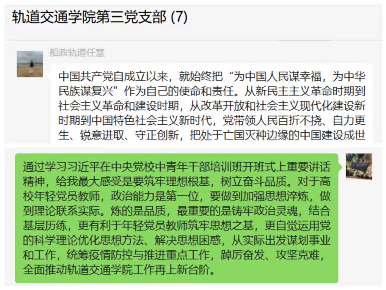 在全校上下合力投身疫情防控阻擊戰(zhàn)期間,軌道交通學(xué)院第三黨支部始終壓實(shí)責(zé)任,時(shí)刻抓牢基層支部建設(shè)不放松,通過支部全體黨員定期參加支部活動(dòng),強(qiáng)化督導(dǎo)線上“三會(huì)一課”質(zhì)量和內(nèi)涵等方式,進(jìn)一步將抓黨建與抓教學(xué)育人緊密結(jié)合,在基層支部引領(lǐng)“黨建促理論學(xué)習(xí),黨建促理論研究,黨建促教書育人”,切實(shí)建強(qiáng)軌道交通學(xué)院第三黨支部戰(zhàn)斗堡壘作用,真正發(fā)揮黨員先鋒模范作用。