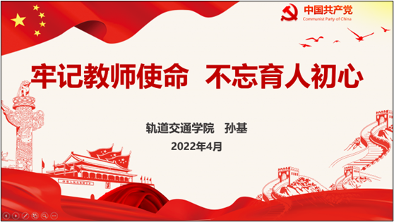 為進(jìn)一步推動常態(tài)化落實(shí)落細(xì)師德師風(fēng)建設(shè),軌道交通學(xué)院各黨支部在四月份開展“強(qiáng)師德 鑄師魂、爭當(dāng)'四有好教師汲取師德失范教訓(xùn)強(qiáng)化師德師風(fēng)建設(shè)、強(qiáng)師德 正師風(fēng) 鑄師魂等為主題的黨日活動。黨員們紛紛表示,通過師德師風(fēng)黨日活動,牢固樹立了師德師風(fēng)底線意識,切實(shí)增強(qiáng)了遵守教師職業(yè)行為十項準(zhǔn)則的思想自覺和行動自覺,要更加以高標(biāo)準(zhǔn)的態(tài)度完成教師在日常教育教學(xué)活動中立德樹人、培養(yǎng)新時代社會主義建設(shè)者和接班人的教育教學(xué)目標(biāo),做黨和人民滿意的“四有”好老師!