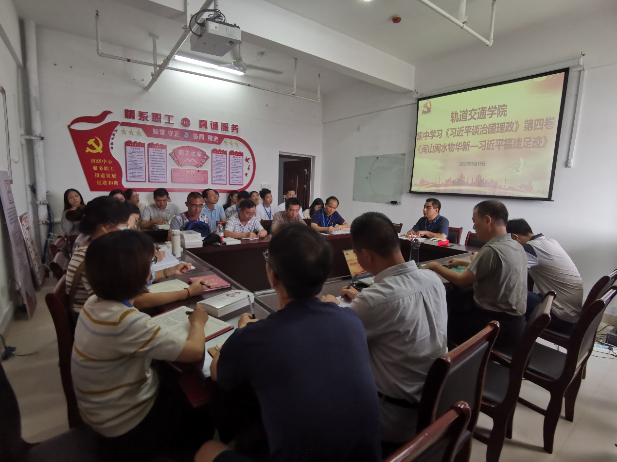 2022年8月16日上午,軌道交通學(xué)院在第一會議室舉行專題學(xué)習(xí)會,采取自學(xué)、研討、觀看視頻等相結(jié)合的方式集中學(xué)習(xí)《習(xí)近平談治國理政》第四卷和《閩山閩水物華新——習(xí)近平福建足跡》。軌道交通學(xué)院全院教職工參加學(xué)習(xí)會,會議由學(xué)院黨總支書記孫基主持。