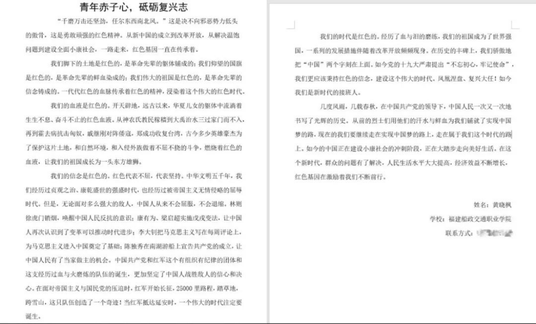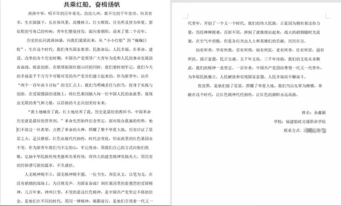 節(jié)選:歷史印證了星星之火,足以燎原。紅色血脈代代相傳,時代會變化,但血液里的紅色基因永不變,作為新青年我們當(dāng)不忘初心、牢記使命,用我們自己的方式向他們致敬,弘揚中華民族傳統(tǒng)美德和光榮傳統(tǒng),將偉大的建黨精神發(fā)揚光大,用歷史的經(jīng)驗譜寫新的篇章,不負(fù)盛世。