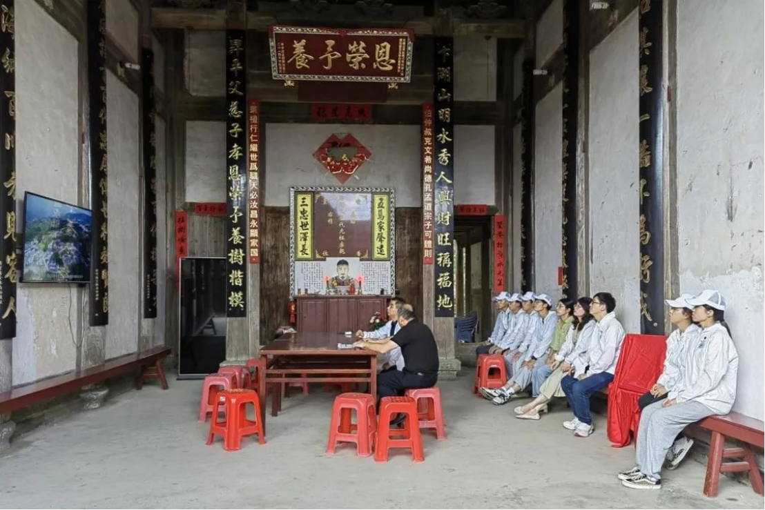 實踐團第二站來到了大洋鎮(zhèn)大展村昇平莊,昇平莊鄢氏家族第七代傳人以微視頻為載體,讓實踐團身臨其境體驗當年昇平莊的硝煙戰(zhàn)火、紅色歲月,并通過文字、圖片,向?qū)嵺`團講解其祖先鄢光椿的故事,追憶崢嶸歲月。莊內(nèi)建有紅色歷史陳列館、“恩榮予養(yǎng)”孝文化主題館、莊寨民俗農(nóng)耕博物館三個展館,展館內(nèi)的一件件老物件不僅在述說著鄢氏百年來的興衰變化,還傳遞著先人盡孝奉親、耕讀傳家的美好品德。實踐團通過學(xué)習(xí)昇平莊的鄉(xiāng)村記憶與文化,更體悟到為文化傳承、鄉(xiāng)村振興做出貢獻的責任擔當。