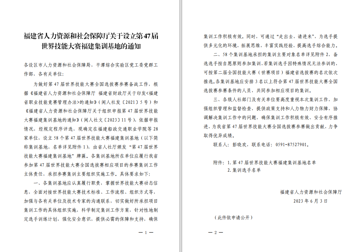 根據(jù)《福建省人力資源和社會(huì)保障廳福建省財(cái)政廳關(guān)于印發(fā)<福建省職業(yè)技能競(jìng)賽管理辦法>的通知》(閩人社發(fā)〔2021〕5號(hào))和《福建省人力資源和社會(huì)保障廳關(guān)于組織申報(bào)第47屆世界技能大賽福建集訓(xùn)基地的通知》(閩人社文〔2023〕11號(hào))文件,我院入選第47屆世界技能大賽“軌道車輛技術(shù)”賽項(xiàng)福建集訓(xùn)基地。