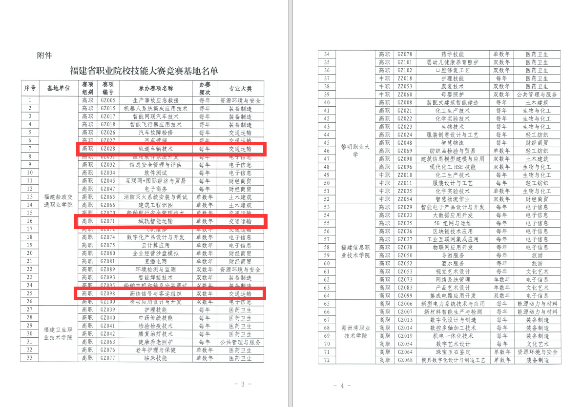 近日,根據(jù)福建省職業(yè)院校技能大賽組委會(huì)《關(guān)于公布福建省職業(yè)院校技能大賽競(jìng)賽基地的通知》,我院獲批福建省職業(yè)院校技能大賽3個(gè)賽項(xiàng)競(jìng)賽基地。競(jìng)賽基地分別承擔(dān)我省軌道車輛技術(shù)(GZ028)、城軌智能運(yùn)輸(GZ071)、高鐵信號(hào)與客運(yùn)組織(GZ098)等3個(gè)賽項(xiàng)的組織實(shí)施工作。競(jìng)賽基地是今后35年省職業(yè)院校技能大賽賽項(xiàng)固定賽點(diǎn)。