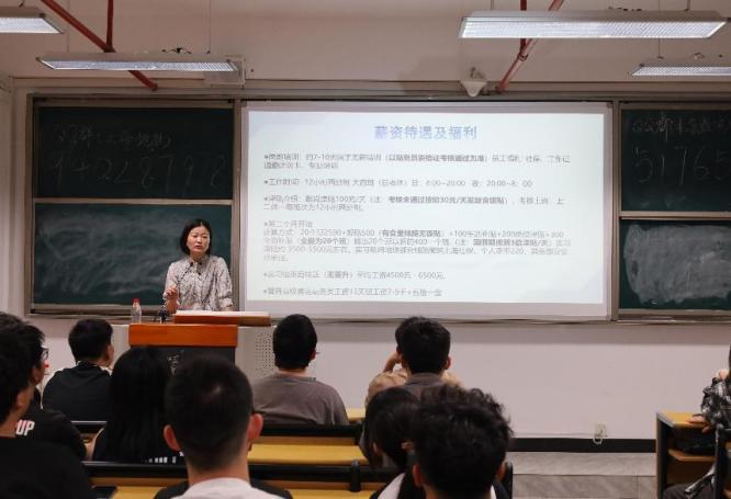 隨后,主講人詳細(xì)介紹了各個崗位的具體工作內(nèi)容,分別是巡視檢查站內(nèi)設(shè)施的廳巡,解答乘客疑問的客服中心和處理突發(fā)事件的站臺。同時,主講人還介紹了工作的時間為輪班制,以及員工宿舍和夜班福利。在宣講會的最后,主講人介紹了薪資構(gòu)成以及員工福利。