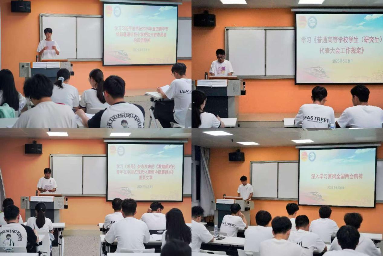 隨后,軌道交通學(xué)院分團(tuán)委志愿者工作部部長(zhǎng)辜海峰同學(xué)對(duì)《普通高等學(xué)校學(xué)生(研究生)代表大會(huì)工作規(guī)定》進(jìn)行了解讀,強(qiáng)調(diào)了學(xué)生會(huì)的工作流程和職責(zé),使同學(xué)們明確了自身的職責(zé)與使命。學(xué)院學(xué)生會(huì)執(zhí)行主席管天養(yǎng)同學(xué)分享學(xué)習(xí)習(xí)近平總書(shū)記給新疆謝依特小學(xué)戍邊支教志愿者的回信精神,并進(jìn)行學(xué)生會(huì)業(yè)務(wù)素質(zhì)培訓(xùn),激勵(lì)大家堅(jiān)定理想信念,勇于擔(dān)當(dāng)作為,為中國(guó)式現(xiàn)代化建設(shè)貢獻(xiàn)青春力量。學(xué)院學(xué)生會(huì)主席團(tuán)成員衛(wèi)楠林同學(xué)領(lǐng)讀《求是》雜志發(fā)表的《激勵(lì)新時(shí)代青年在中國(guó)式現(xiàn)代化建設(shè)中挺膺擔(dān)當(dāng)》重要文章,文章中總書(shū)記對(duì)青年寄予厚望,強(qiáng)調(diào)了青年在中國(guó)式現(xiàn)代化建設(shè)中的重要作用。衛(wèi)楠林希望大家牢記習(xí)近平總書(shū)記的殷殷囑托,堅(jiān)定不移聽(tīng)黨話(huà)、跟黨走,在中國(guó)式現(xiàn)代化建設(shè)中挺膺擔(dān)當(dāng)!