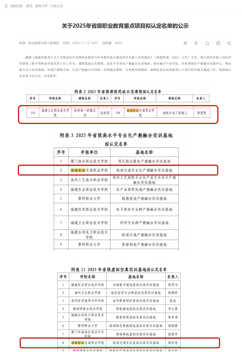 近日,福建省教育廳公布2025年省級職業(yè)教育重點項目擬認定名單,軌道交通學(xué)院共有3個重點項目入圍。其中,陳天炎院長牽頭負責(zé)的《軌道交通專業(yè)化產(chǎn)教融合實訓(xùn)基地》被認定為2025年省級高水平專業(yè)化產(chǎn)教融合實訓(xùn)基地;陳宏意副院長牽頭負責(zé)的《軌道交通安全虛擬仿真實訓(xùn)基地》被認定為2025年省級虛擬仿真實訓(xùn)基地;陳景煦博士負責(zé)的《地鐵車站工程施工》被認定為2025年省級課程思政示范課程。