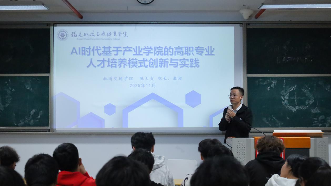 為主動(dòng)適配 AI 技術(shù)發(fā)展對(duì)職業(yè)教育的新要求,深化產(chǎn)業(yè)學(xué)院建設(shè),優(yōu)化學(xué)院人才培養(yǎng)模式,幫助學(xué)生把握AI技術(shù)與職業(yè)教育融合的發(fā)展機(jī)遇。近日,我院軌道交通學(xué)院院長(zhǎng)陳天炎教授作題為“AI時(shí)代基于產(chǎn)業(yè)學(xué)院的高職專業(yè)人才培養(yǎng)模式創(chuàng)新與實(shí)踐”的專題講座。軌道交通學(xué)院學(xué)生現(xiàn)場(chǎng)聆聽講座。