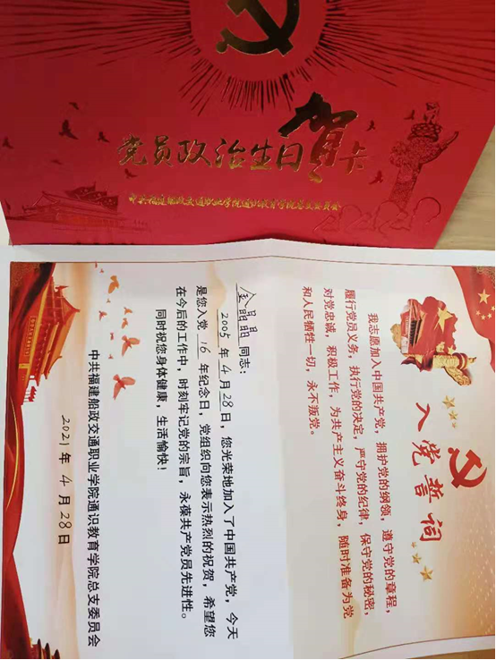 為深入開展黨史學(xué)習(xí)教育,進(jìn)一步加強(qiáng)黨員理想信念教育,創(chuàng)新思想政治工作的方式方法,近日,通識(shí)教育學(xué)院黨總支把開展“黨員過政治生日”工作納入黨建工作和隊(duì)伍建設(shè)工作??傊?duì)照每位黨員的入黨時(shí)間(被確定為預(yù)備黨員的時(shí)間),建立黨員“政治生日”活動(dòng)名冊(cè),排出“政治生日”序列,明確要求在每名黨員“政治生日”當(dāng)天送去一份“政治生日”賀卡,并開展談心談話。通過開展“黨員過政治生日”,加強(qiáng)了黨員理想信念教育,強(qiáng)化黨員的身份意識(shí)和責(zé)任意識(shí),增強(qiáng)黨員榮譽(yù)感、歸屬感,搭建黨組織與黨員之間的“連心橋”,提高黨總支的向心力、凝聚力和戰(zhàn)斗力,推進(jìn)黨史學(xué)習(xí)教育走深走實(shí)。