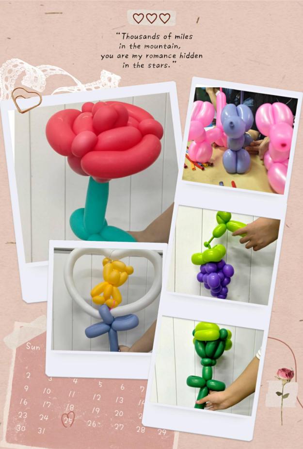 氣球?yàn)槿藗兊纳顜?lái)許多樂(lè)趣,色彩繽紛的氣球,裝點(diǎn)了我們看似平淡的生活。設(shè)計(jì)喜愛(ài)的氣球造型送給家人朋友,能給他們制造意外小驚喜。經(jīng)過(guò)大家的一雙雙巧手,簡(jiǎn)單的氣球變身為動(dòng)物、植物、愛(ài)心,增添了無(wú)數(shù)的生活情趣!