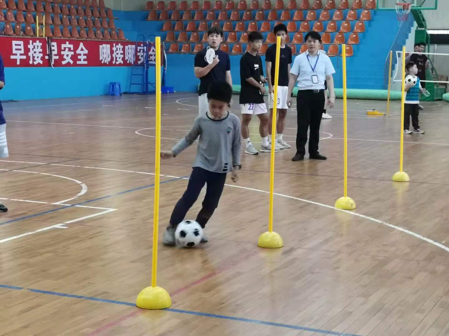 在運球繞桿射門活動中,通識教育學院教師王發(fā)振和學校足球俱樂部學生對兒童開展愛國主義教育,并耐心指導兒童運球繞桿和射門技巧,提高兒童的競爭意識,培養(yǎng)球感、協(xié)調性、靈敏性以及對足球運動的興趣。