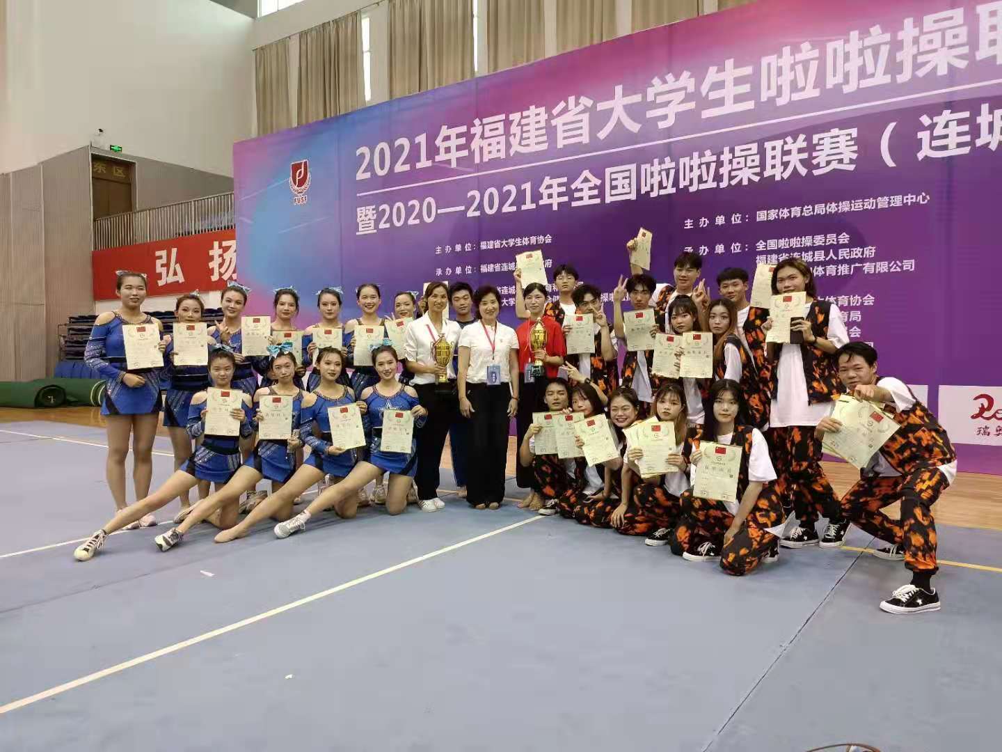 我校代表隊以出色的表現(xiàn)征服了現(xiàn)場的評委和觀眾,獲得花球校園啦啦操示范套路冠軍、街舞啦啦操示范套路冠軍、雙人街舞啦啦操自選動作第二名的優(yōu)異成績。