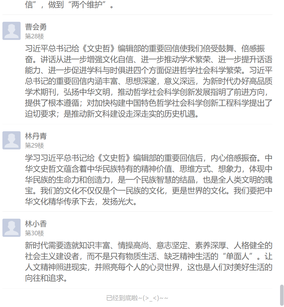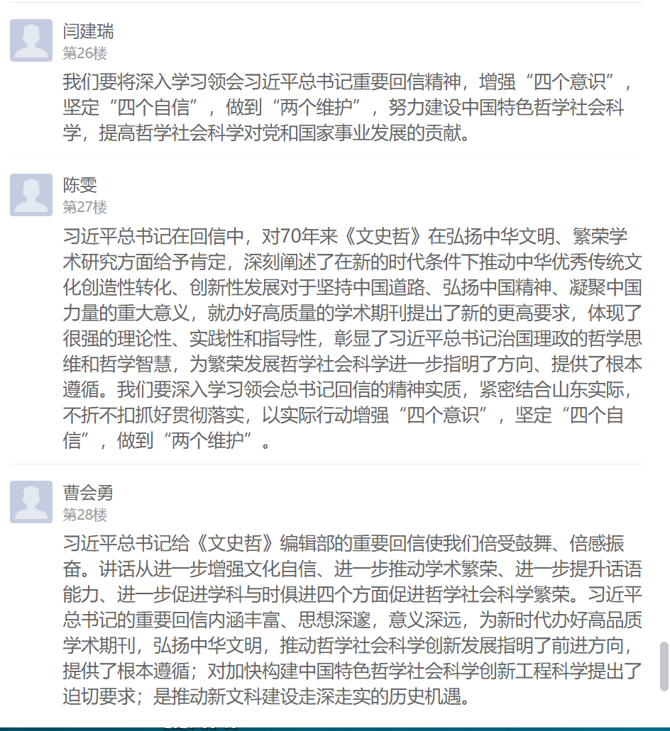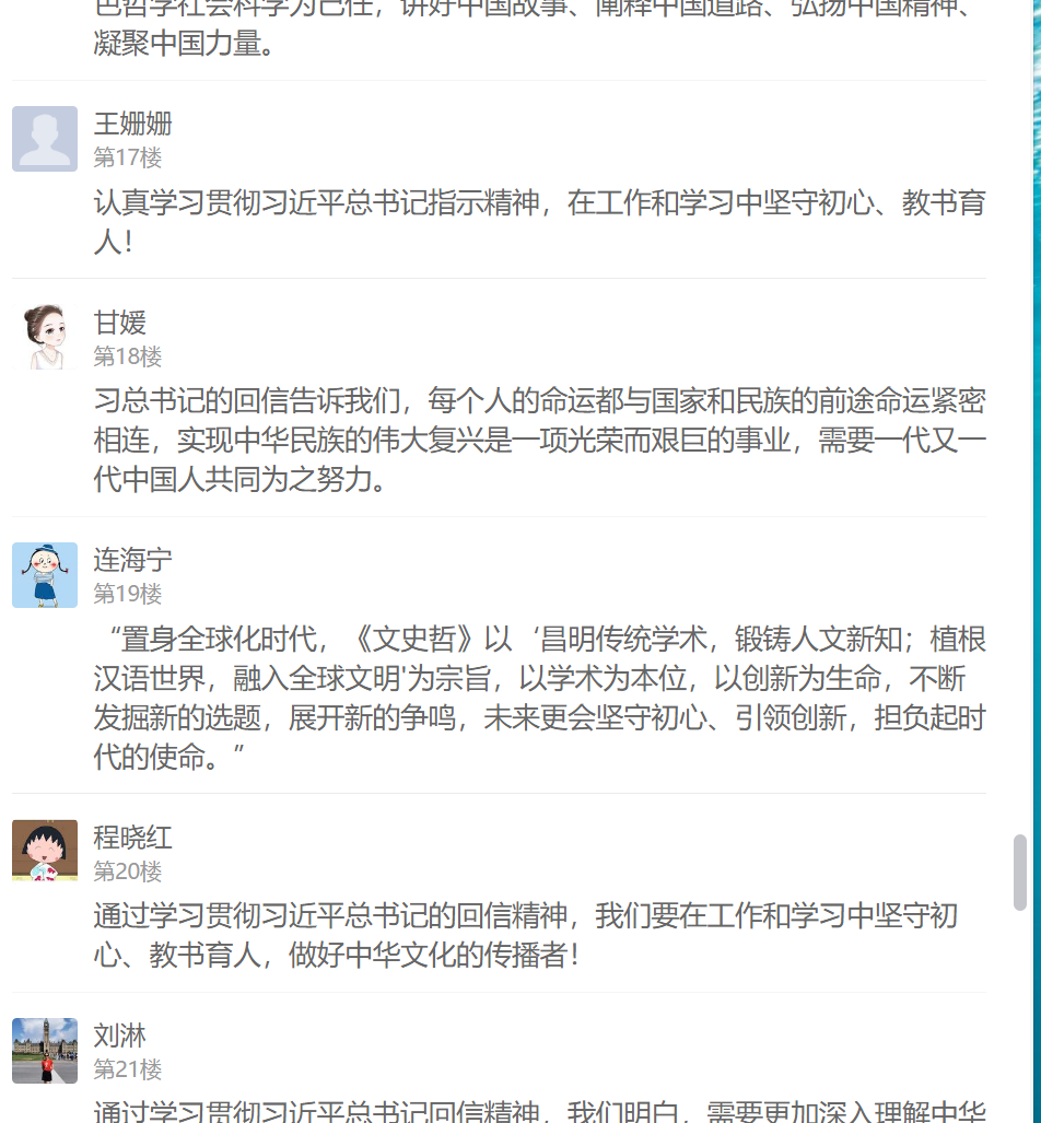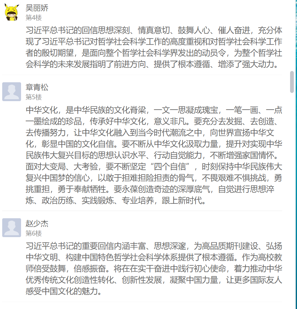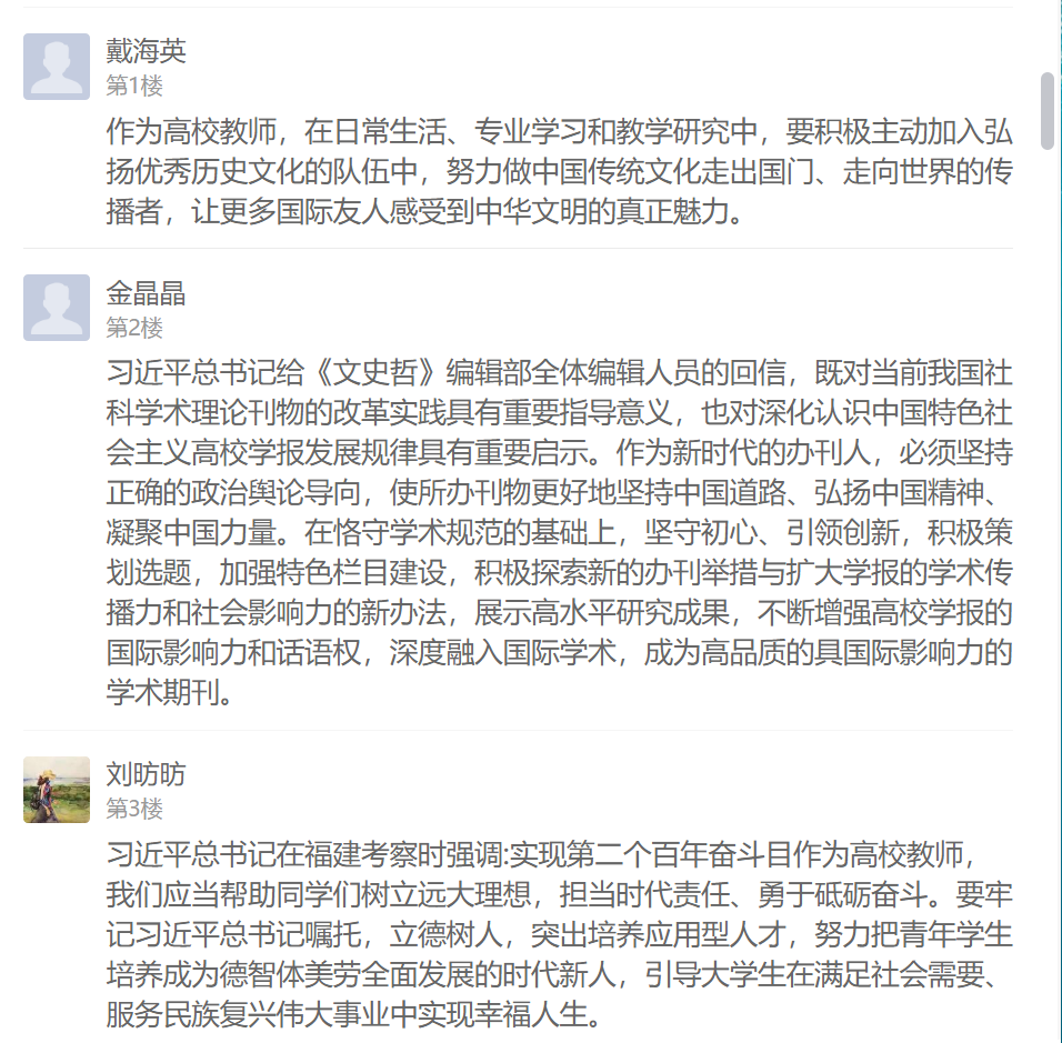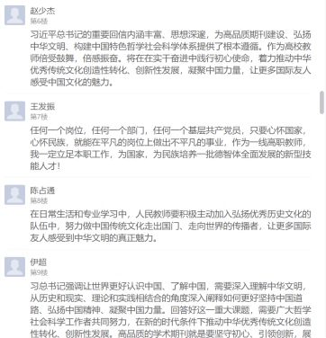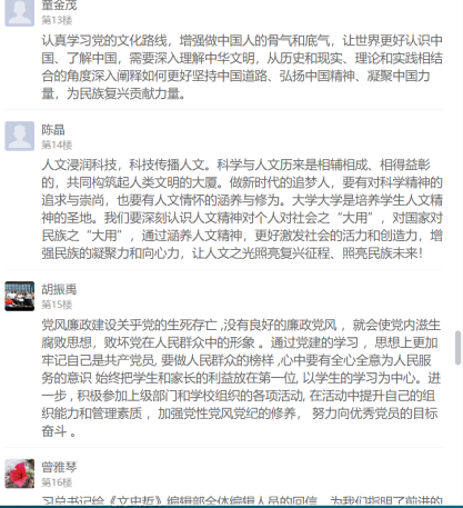 習(xí)近平總書記的回信在支部黨員中引起強(qiáng)烈反響,不僅在學(xué)習(xí)現(xiàn)場熱烈交流學(xué)習(xí)感想,還在線上學(xué)習(xí)通總支討論區(qū)紛紛留言發(fā)表心得體會(huì)。